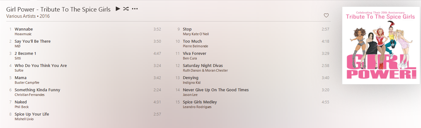 Hola Spice Family, seguimos de fiesta con la #SpiceWeek, el día de hoy les traigo un tributo muy especial, fans alrededor del mundo se han dedicado a hacer covers de las canciones de nuestras chicas, algunos de esos covers en verdad son joyas que deben ser escuchadas por cualquier fan de las Spice. Se me ocurrió que para este 20 Aniversario de Wannabe, podría armar un disco con los mejores covers que me he encontrado en Internet y este es el resultado. El trabajo de muchos artistas al hacer los covers, el mio al darme la tarea de buscarlos y seleccionar solo los que mas me gustaron, espero que realmente lo disfruten.