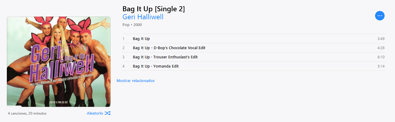 Hola Spice Family, el día de hoy les traigo de rapidin un single de nuestra Geri, Bag It Up, que a mi parecer es una de sus mejores y mas gays canciones, incluyendo el video. Con varios remixes este es el segundo single que salio de esta canción, el primero lo pueden encontrar en publicaciones anteriores.