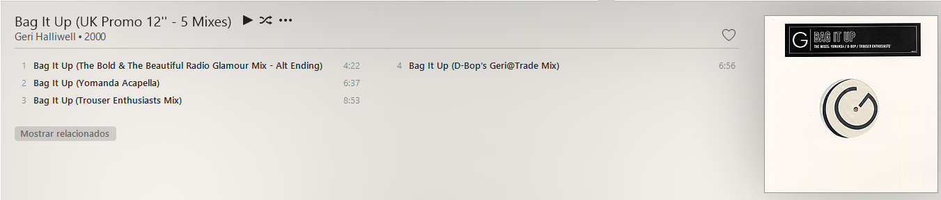 Buenos días Spice Family, el día de hoy les traigo un pomo un tanto raro (supongo yo) del single Bag It Up de Geri, este siendo single de su primer disco como solista es una de mis canciones favoritas por que es divertida, esta canción para mi es la esencia de Geri hecha canción y letra. Este promo proviene de un vinyl el cual contiene 5 remixes de esta canción los 5 tan buenos como el single original.
